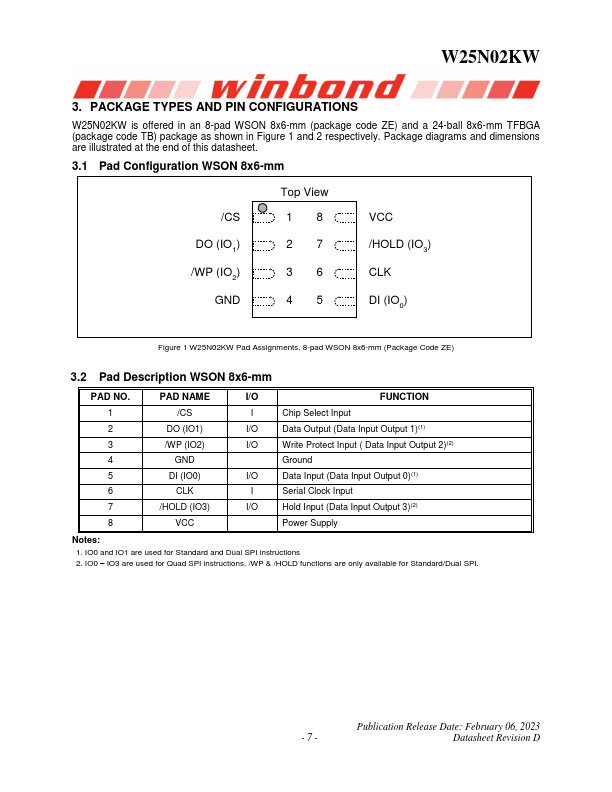W25N02KW 1.8V 2G-BIT SLC QSPINAND FLASH MEMORY WITH DUAL/QUAD SPI BUFFER READ & SEQUENTIAL READ Publication Release Date: February 06, 2023 Datasheet Revision D W25N02KW 1. GENERAL DESCRIPTIONS The W25N02KW (2G-bit) SLC QspiNAND Flash Memory provides a storage solution for systems with limited space, pins and power.