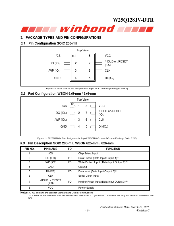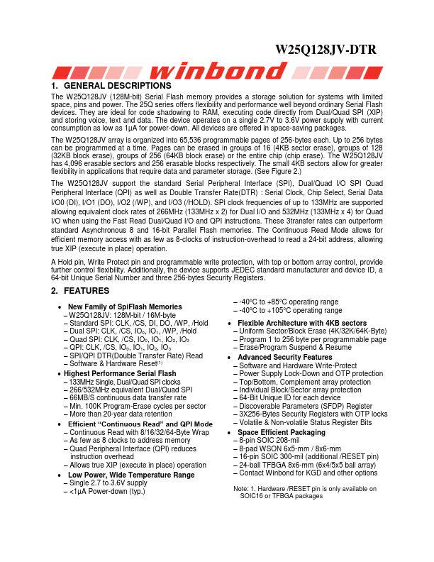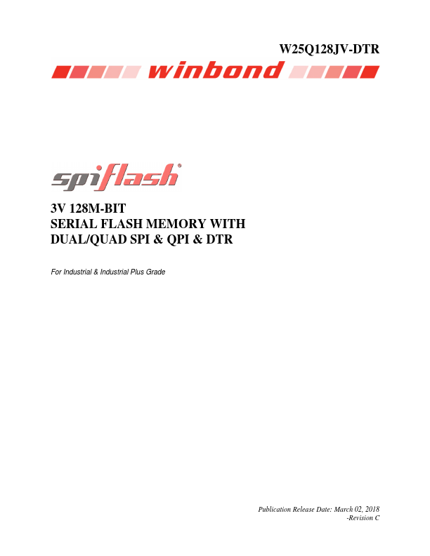 W25Q128JV-DTR 3V 128M-BIT SERIAL FLASH MEMORY WITH DUAL/QUAD SPI & QPI & DTR For Industrial & Industrial Plus Grade Publication Release Date: March 02, 2018 -Revision C W25Q128JV-DTR 1. GENERAL DESCRIPTIONS The W25Q128JV (128M-bit) Serial Flash memory provides a storage solution for systems with limited space, pins and power.