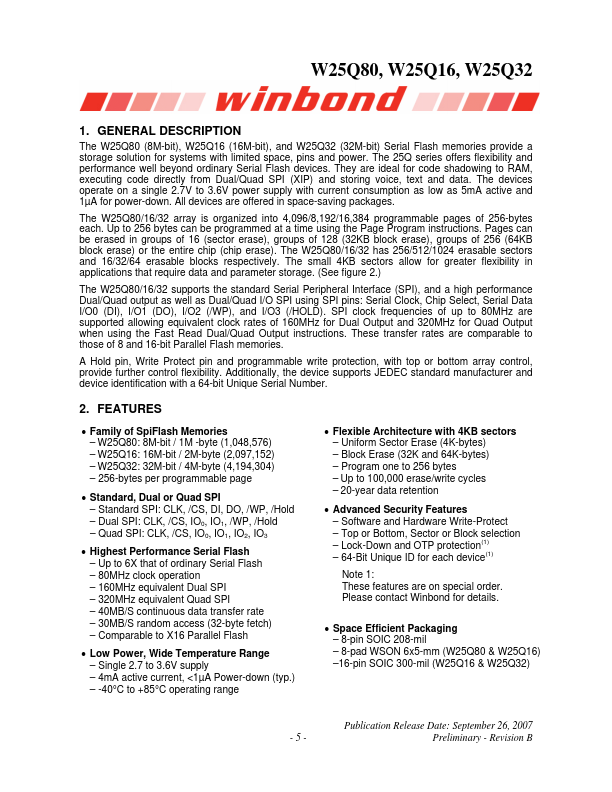 The W25Q80 (8M-bit), W25Q16 (16M-bit), and W25Q32 (32M-bit) Serial Flash memories provide a storage solution for systems with limited space, pins and power. The 25Q series offers flexibility and performance well beyond ordinary Serial Flash devices. They are ideal for code shadowing to RAM, executing code directly from Dual/Quad SPI (XIP) and storing voice, text and data.