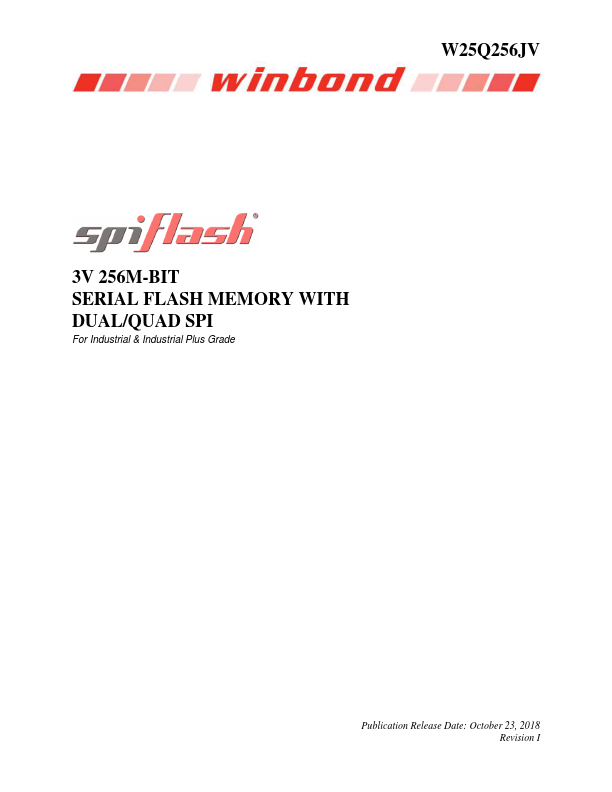 W25Q256JV 3V 256M-BIT SERIAL FLASH MEMORY WITH DUAL/QUAD SPI For Industrial & Industrial Plus Grade Publication Release Date: October 23, 2018 Revision I W25Q256JV 1. GENERAL DESCRIPTIONS The W25Q256JV (256M-bit) Serial Flash memory provides a storage solution for systems with limited space, pins and power.