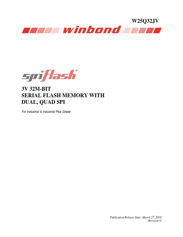 W25Q32JV 3V 32M-BIT SERIAL FLASH MEMORY WITH DUAL, QUAD SPI For Industrial & Industrial Plus Grade Publication Release Date: March 27, 2018 -Revision G W25Q32JV 1. GENERAL DESCRIPTIONS The W25Q32JV (32M-bit) Serial Flash memory provides a storage solution for systems with limited space, pins and power.