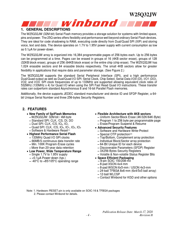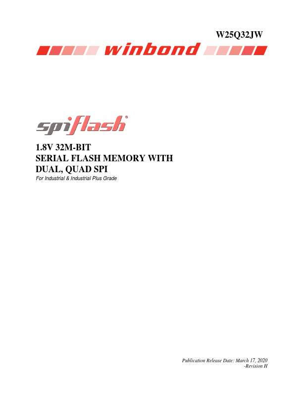 W25Q32JW 1.8V 32M-BIT SERIAL FLASH MEMORY WITH DUAL, QUAD SPI For Industrial & Industrial Plus Grade Publication Release Date: March 17, 2020 -Revision H W25Q32JW 1. GENERAL DESCRIPTIONS The W25Q32JW (32M-bit) Serial Flash memory provides a storage solution for systems with limited space, pins and power.