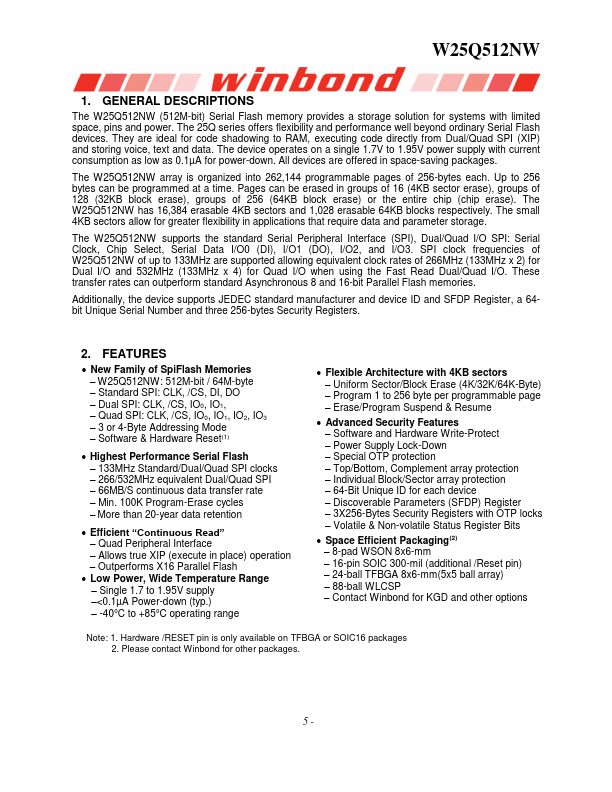 W25Q512NW 1.8V 512M-BIT SERIAL FLASH MEMORY WITH DUAL/QUAD SPI Publication Release Date: December 7, 2020 Preliminary -Revision A6 W25Q512NW 1. GENERAL DESCRIPTIONS The W25Q512NW (512M-bit) Serial Flash memory provides a storage solution for systems with limited space, pins and power.