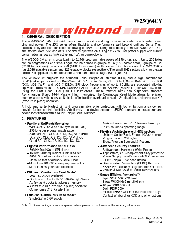 The W25Q64CV (64M-bit) Serial Flash memory provides a storage solution for systems with limited space, pins and power. The 25Q series offers flexibility and performance well beyond ordinary Serial Flash devices. They are ideal for code shadowing to RAM, executing code directly from Dual/Quad SPI (XIP) and storing voice, text and data.