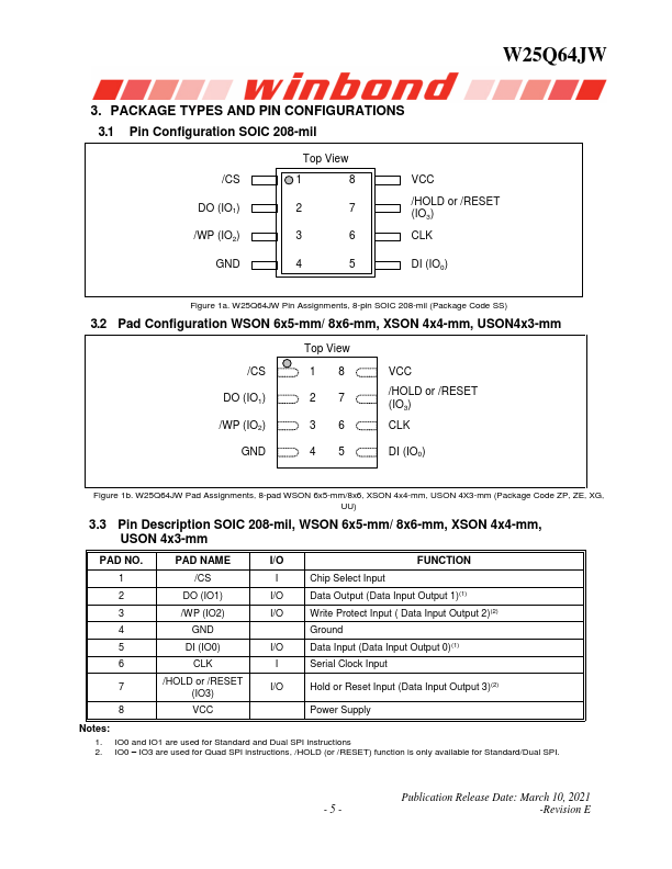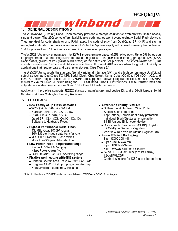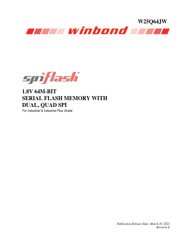 W25Q64JW 1.8V 64M-BIT SERIAL FLASH MEMORY WITH DUAL, QUAD SPI For Industrial & Industrial Plus Grade Publication Release Date: March 10, 2021 -Revision E W25Q64JW 1. GENERAL DESCRIPTIONS The W25Q64JW (64M-bit) Serial Flash memory provides a storage solution for systems with limited space, pins and power.