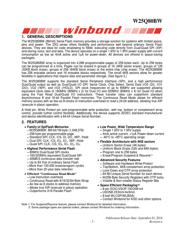 W25Q80BW 1.8V 8M-BIT SERIAL FLASH MEMORY WITH DUAL AND QUAD SPI Publication Release Date: September 01, 2014 -1- Revision L W25Q80BW 1. GENERAL DESCRIPTIONS The W25Q80BW (8M-bit) Serial Flash memory provides a storage solution for systems with limited space, pins and power.
