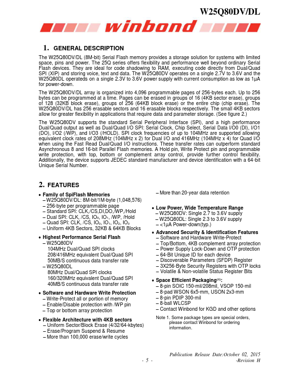 The W25Q80DV/DL (8M-bit) Serial Flash memory provides a storage solution for systems with limited space, pins and power. The 25Q series offers flexibility and performance well beyond ordinary Serial Flash devices. They are ideal for code shadowing to RAM, executing code directly from Dual/Quad SPI (XIP) and storing voice, text and data.