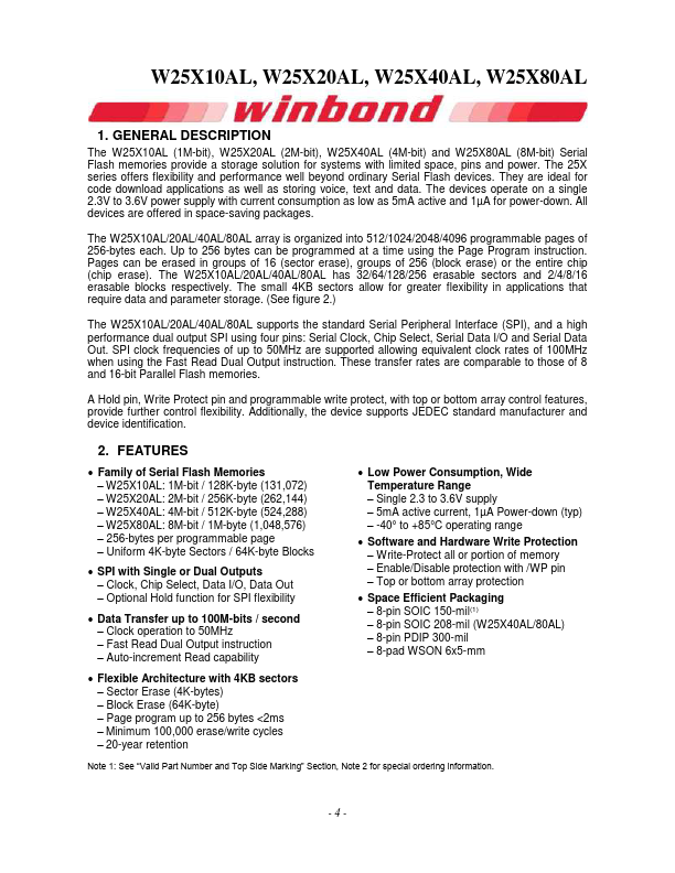 - W25X40AL: 4M-bit / 512K-byte (524,288)