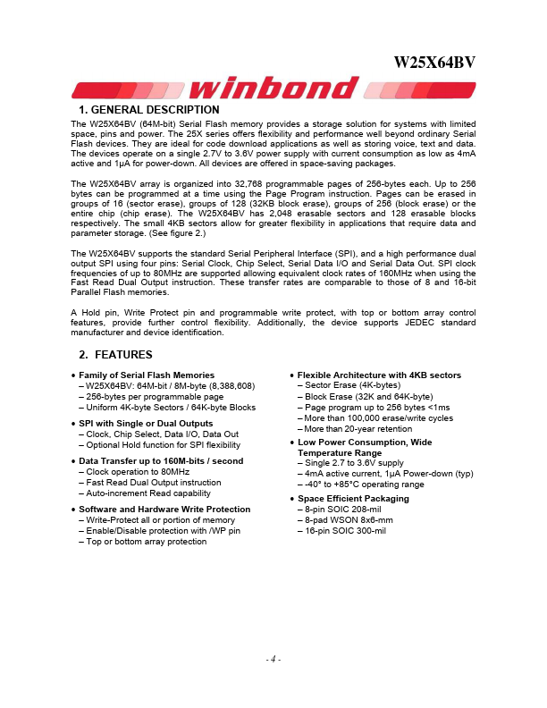 The W25X64BV (64M-bit) Serial Flash memory provides a storage solution for systems with limited space, pins and power. The 25X series offers flexibility and performance well beyond ordinary Serial Flash devices. They are ideal for code download applications as well as storing voice, text and data.
