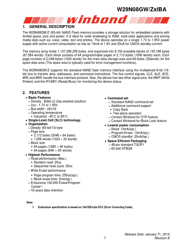 The W29N08GW/Z (8G-bit) NAND Flash memory provides a storage solution for embedded systems with limited space, pins and power. It is ideal for code shadowing to RAM, solid state applications and storing media data such as, voice, video, text and photos. The device operates on a single 1.7V to 1.95V power supply with active current consumption as low as 13mA at 1.8V and 20uA for CMOS standby current.