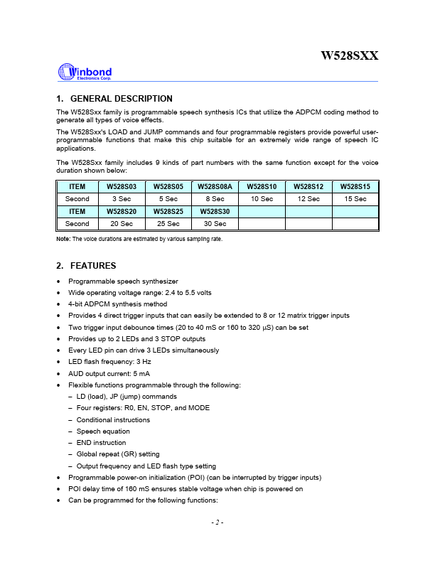 The W528Sxx family is programmable speech synthesis ICs that utilize the ADPCM coding method to generate all types of voice effects.