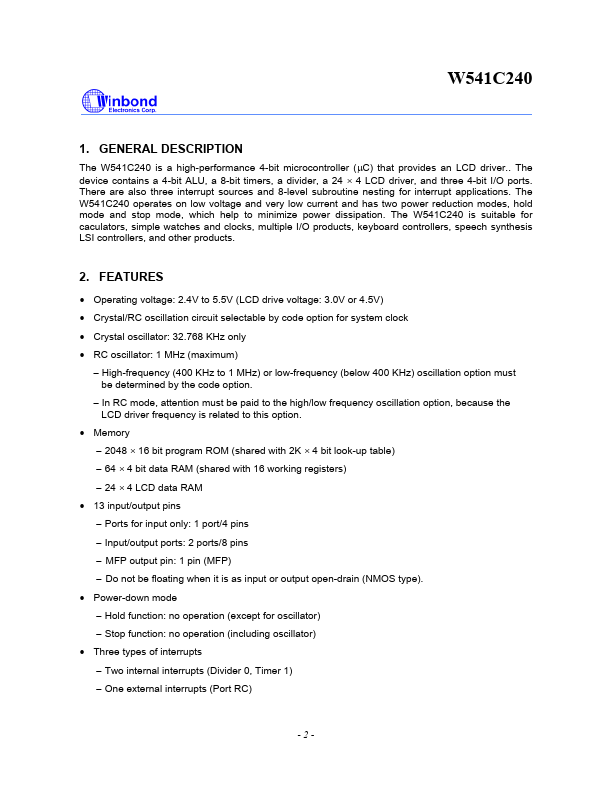 The W541C240 is a high-performance 4-bit microcontroller (µC) that provides an LCD driver.