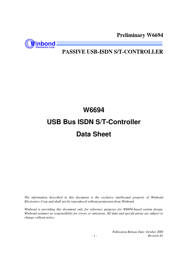 The Winbond's single chip USB bus ISDN S/T interface controller W6694 is an all-in-one device suitable for ISDN Internet access.