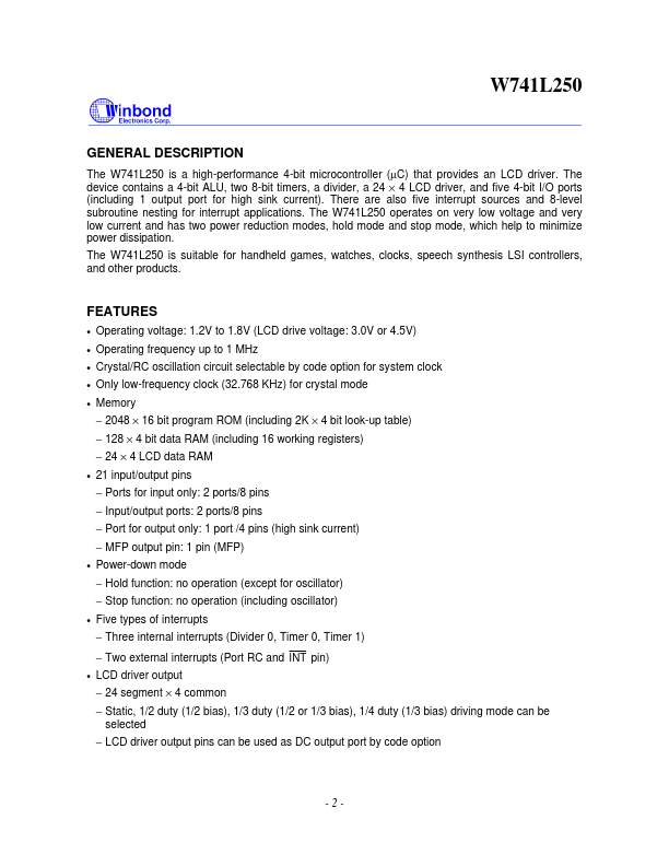 The W741L250 is a high-performance 4-bit microcontroller (µC) that provides an LCD driver. The device contains a 4-bit ALU, two 8-bit timers, a divider, a 24 × 4 LCD driver, and five 4-bit I/O ports (including 1 output port for high sink current).