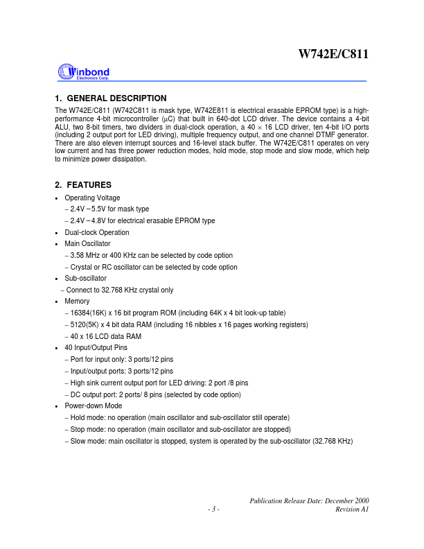 The W742E/C811 (W742C811 is mask type, W742E811 is electrical erasable EPROM type) is a highperformance 4-bit microcontroller (µC) that built in 640-dot LCD driver. The device contains a 4-bit ALU, two 8-bit timers, two dividers in dual-clock operation, a 40 × 16 LCD driver, ten 4-bit I/O ports (including 2 output port for LED driving), multiple frequency output, and one channel DTMF generator.