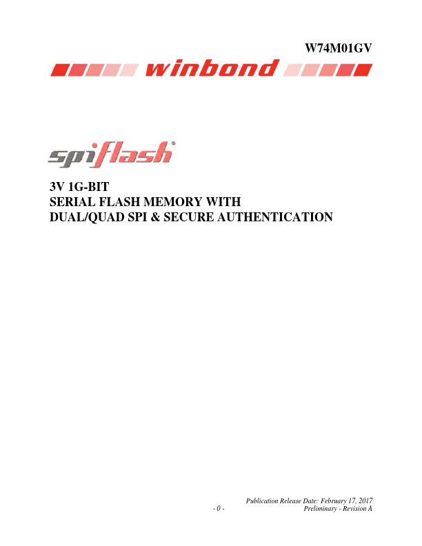 The W74M01GV (1G-bit) Serial Flash memory provides a storage solution for systems with limited space, pins and power. The W74 series offers flexibility and performance well beyond ordinary Serial Flash devices.