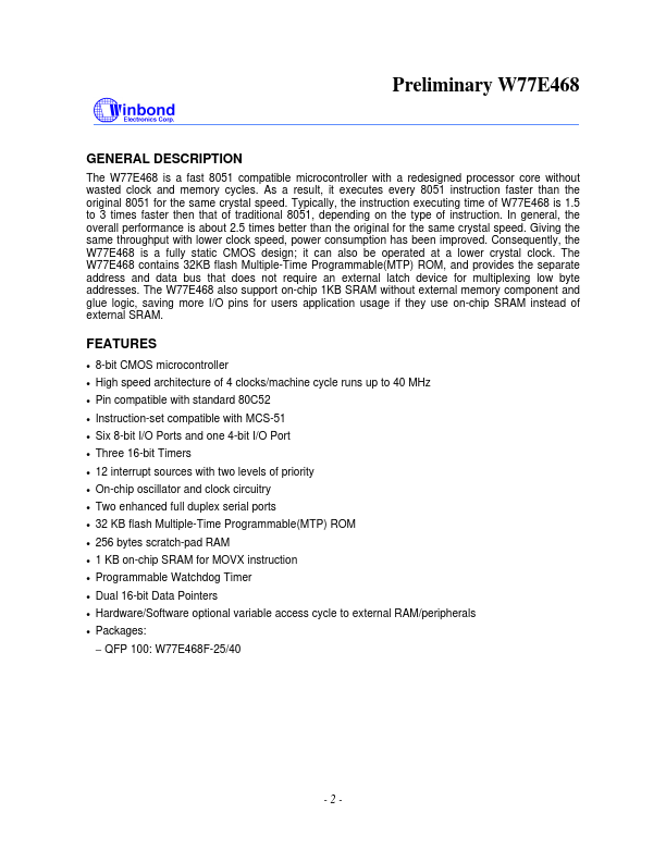 The W77E468 is a fast 8051 compatible microcontroller with a redesigned processor core without wasted clock and memory cycles. As a result, it executes every 8051 instruction faster than the original 8051 for the same crystal speed.