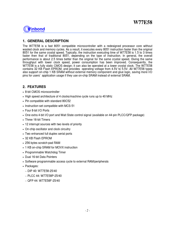 The W77E58 is a fast 8051 compatible microcontroller with a redesigned processor core without wasted clock and memory cycles. As a result, it executes every 8051 instruction faster than the original 8051 for the same crystal speed.