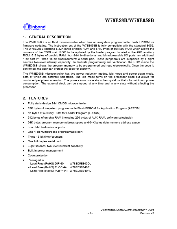 The W78E058B is an 8-bit microcontroller which has an in-system programmable Flash EPROM for firmware updating. The instruction set of the W78E058B is fully compatible with the standard 8052.