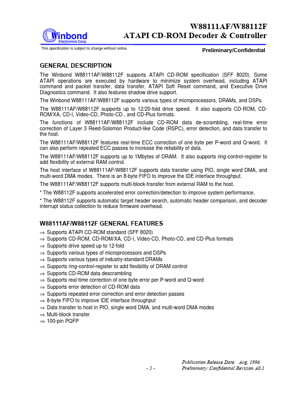 The Winbond W88111AF/W88112F supports ATAPI CD-ROM specification (SFF 8020). Some ATAPI operations are executed by hardware to minimize system overhead, including ATAPI mand and packet transfer, data transfer, ATAPI Soft Reset mand, and Executive Drive Diagnostics mand.