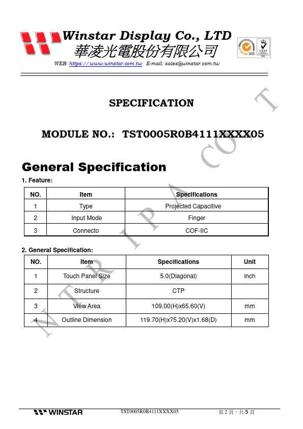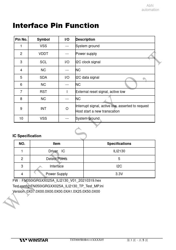 -- System ground --- Power supply I/O I2C clock signal --- NC I/O I2C data signal --- NC I External reset signal, active low --- NC Interrupt signal, active low, asserted to request O Host start a new transcation --- System ground IC Specification NO. Item Specifications Temperature 1 Operation -30~80℃ 2 Storage -30~80℃ Note: Testing environment is under normal atmospheric pressure.
