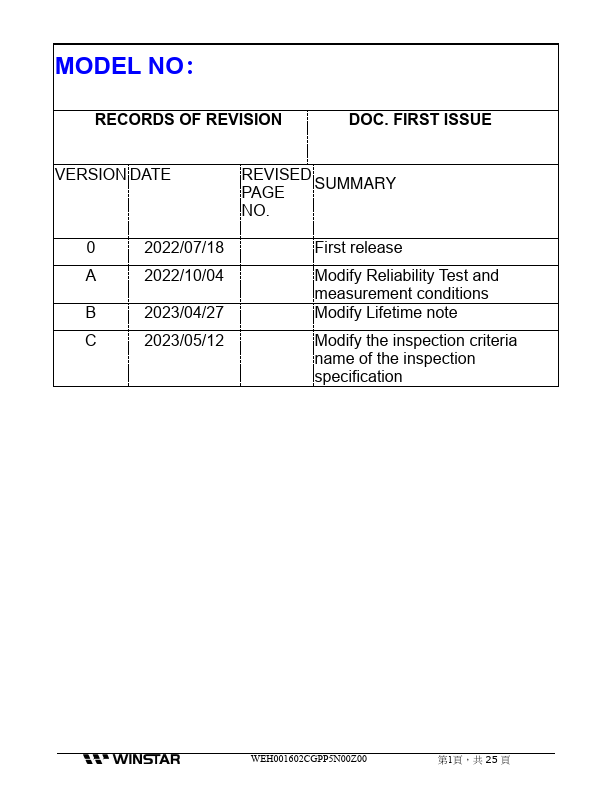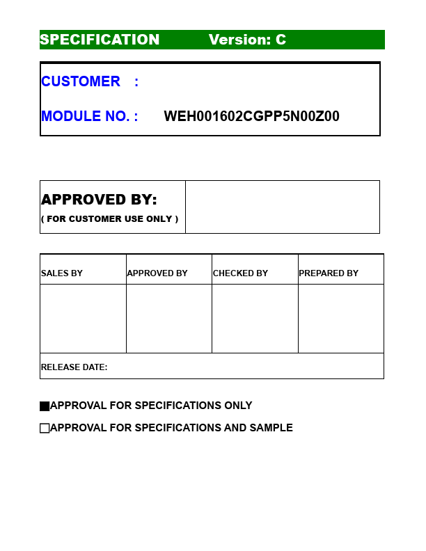 OLED SPECIFICATION Model No: WEH001602CGPP5N00Z00 APPROVAL FOR SPECIFICATIONS ONLY □APPROVAL FOR SPECIFICATIONS AND SAMPLE ( ) SPECIFICATION Version: WEH001602CGPP5N00Z00 APPROVED BY:.