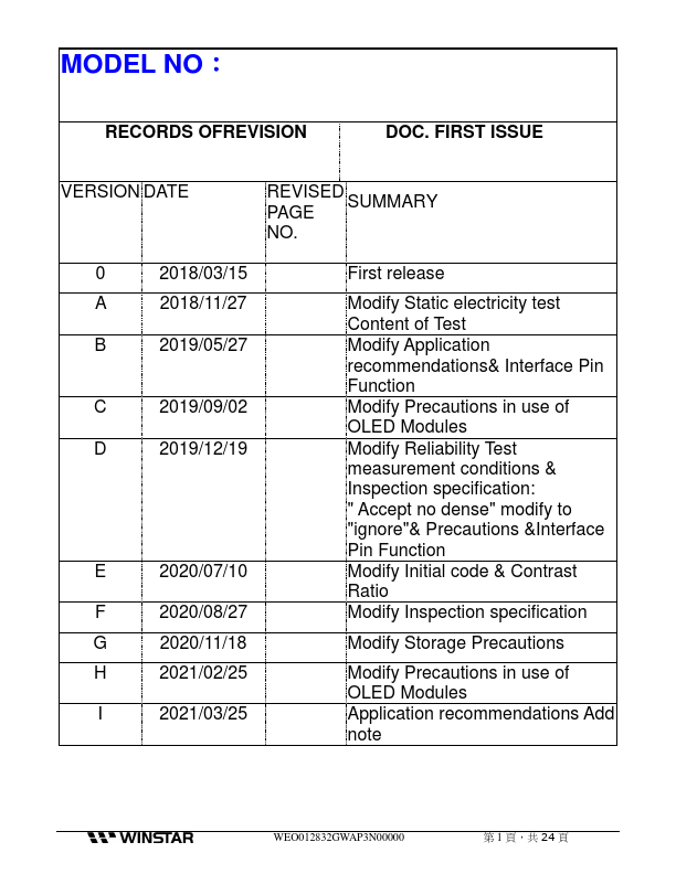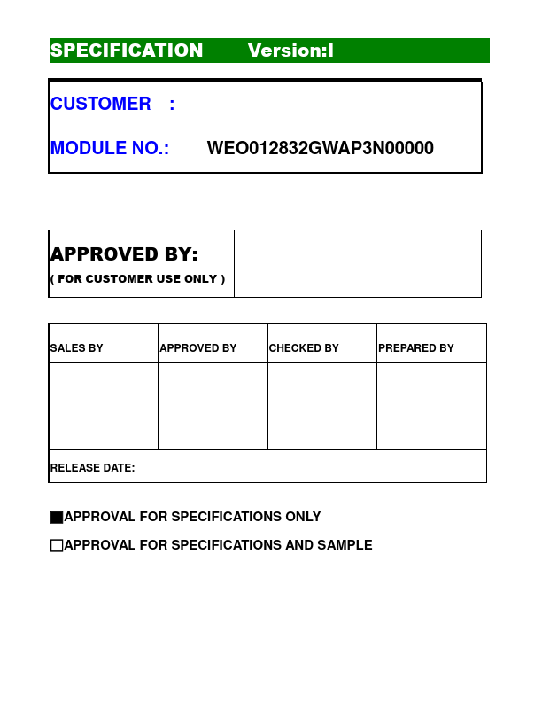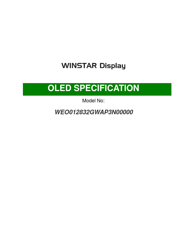 OLED SPECIFICATION Model No: WEO012832GWAP3N00000 APPROVAL FOR SPECIFICATIONS ONLY □APPROVAL FOR SPECIFICATIONS AND SAMPLE ( ) SPECIFICATION Version:I CUSTOMER : WEO012832GWAP3N00000 APPROVED BY:.