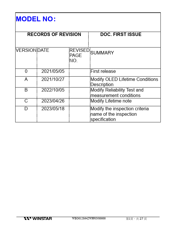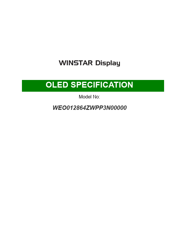 Modify Reliability Test and measurement conditions Modify Lifetime note Modify the inspection criteria name of the inspection specification WEO012864ZWPP3N00000 第1頁,共 27 頁 Contents 1.Module Classification Information 2.General Specification 3.Contour Drawing & Block Diagram 4.Interface Pin Function 5. Without Polarizer A:Anti-glare Polarizer 8 Display Mode P:Passive Matrix ; N:Active Matrix 9 Driver Voltage...