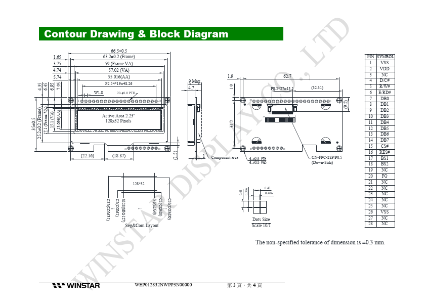 OLED SPECIFICATION Model No: WEP012832N APPROVA NS AN ) General Specification Item Dot Matrix Module dimension Active Area Pixel Size Pixel Pitch Display Mode Display Color Drive Duty IC Interface Size Dimension Unit 128 x 32 Dots - 66.5 × 35.0 × 9 Max. WEP012832NWPP3N00000 第 3 頁,共 4 頁 Interface Pin Function No.