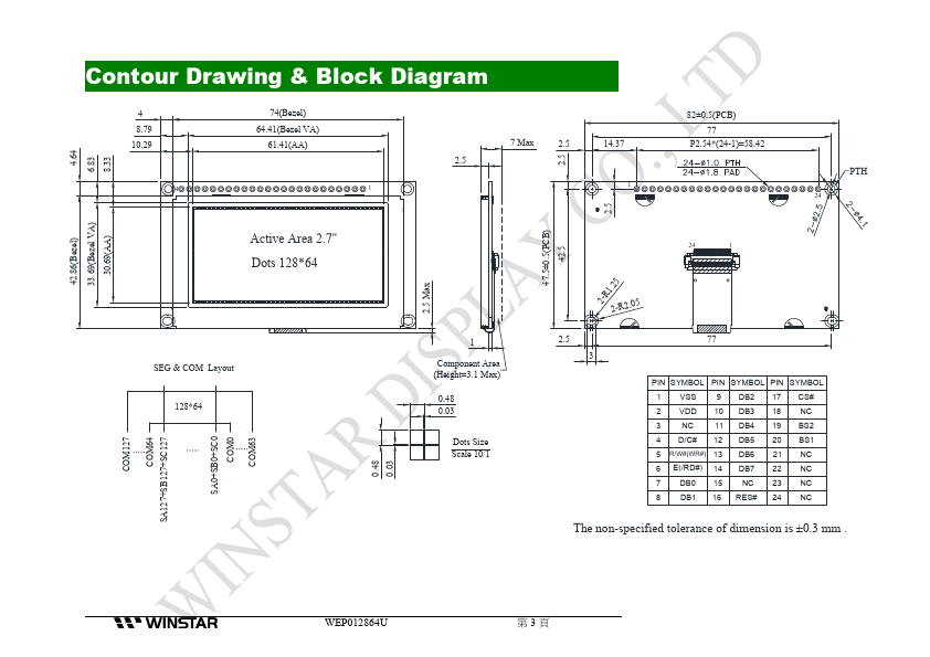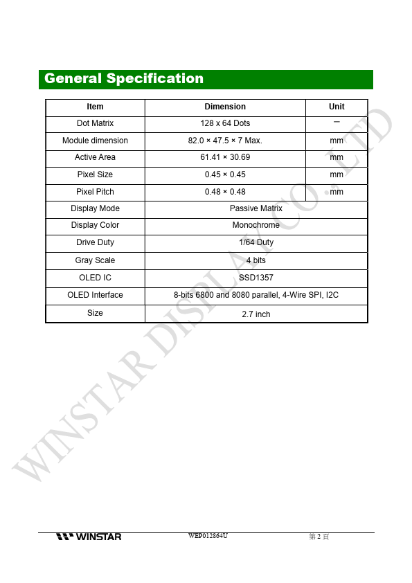 OLED SPECIFICATION Model No: WEP012864U ICATIONS AND General Specification Item Dot Matrix Module dimension Active Area Pixel Size Pixel Pitch Display Mode Display Color Drive Duty Gray Scale OLED IC OLED Interface Size Dimension Unit 128 x 64 Dots - 82.0 × 47.5 × 7 Max. Symbol Function 1 VSS This is a ground pin.