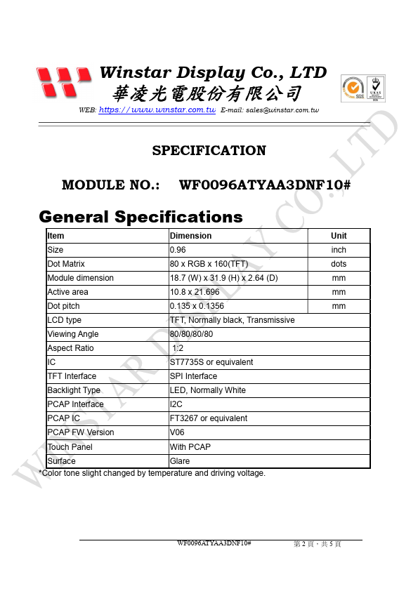 Winstar Display Co., LTD 華凌光電股份有限公司 WEB: https://.winstar..tw E-mail: sales@winstar..tw SPECIFICATION MODULE NO.:.
