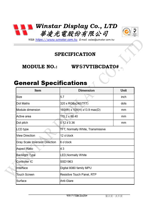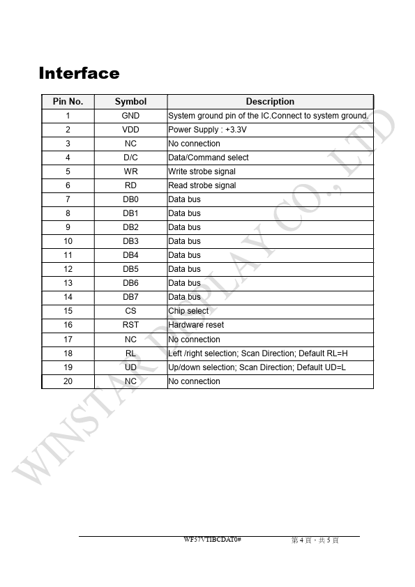 System ground pin of the IC.Connect to system ground. +3.3V No connection Data/mand select Write strobe signal Read strobe signal Data bus Data bus Data bus Data bus Data bus Data bus Data bus Data bus Chip select Hardware reset No connection Left /right selection; Default RL=H Up/down selection;.