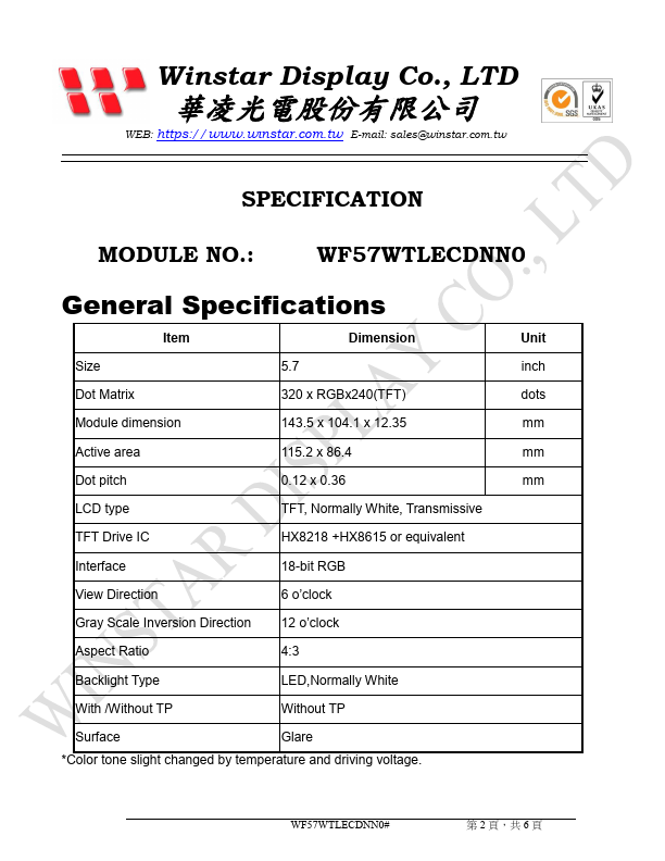 WF57WTLECDNN0 is LCD manufactured by WINSTAR Display.
