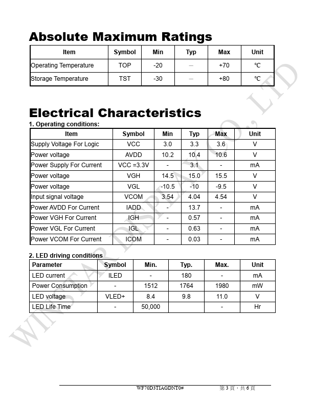 WF70D3TIAGDNT0 is TFT Display manufactured by WINSTAR Display.