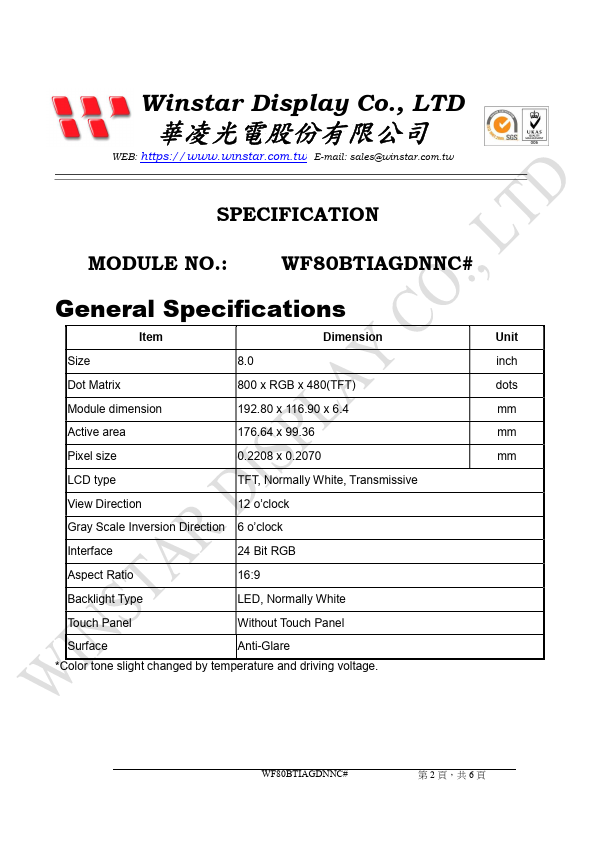 Winstar Display Co., LTD 華凌光電股份有限公司 WEB: https://.winstar..tw E-mail: sales@winstar..tw SPECIFICATION MODULE NO.:.