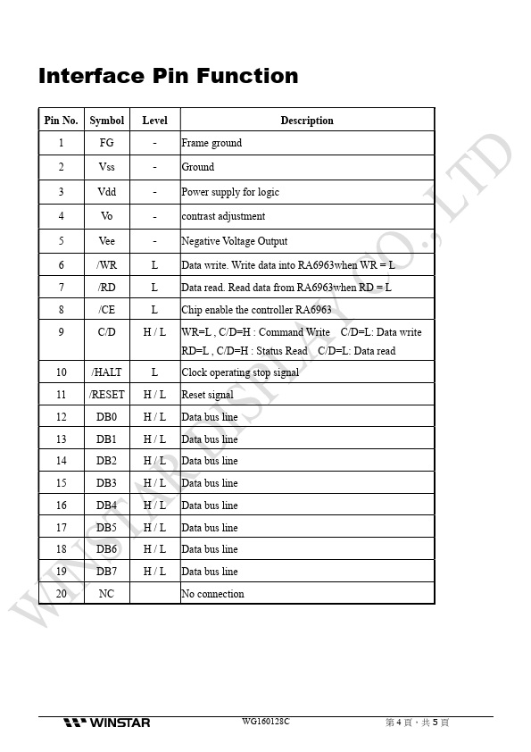 2 Vss - Ground 3 Vdd - Power supply for logic 4 Vo - contrast adjustment 5 Vee - Negative Voltage Output 6 /WR L Data write. Write data into RA6963when WR = L 7 /RD L Data read. Read data from RA6963when RD = L 8 /CE L Chip enable the controller RA6963 9 C/D H / L WR=L , C/D=H.