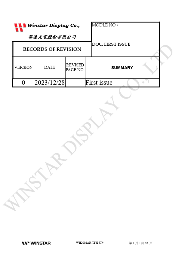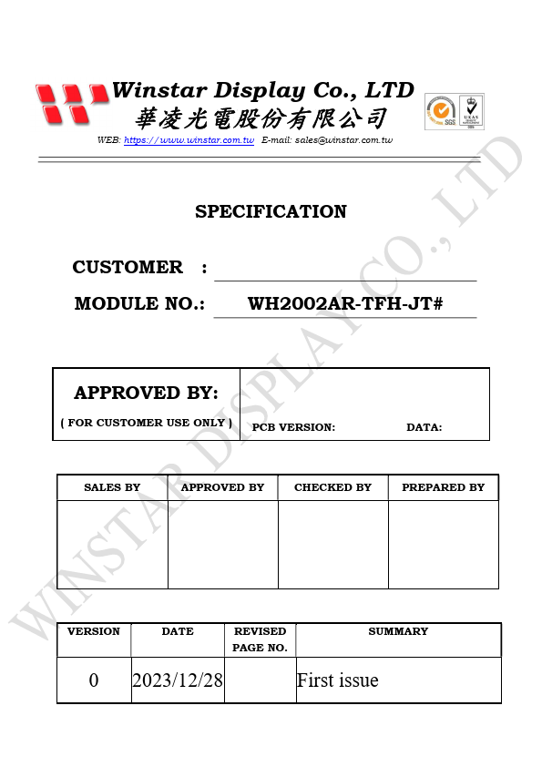 Winstar Display Co., LTD 華凌光電股份有限公司 WEB: https://.winstar..tw E-mail: sales@winstar..tw SPECIFICATION CUSTOMER.