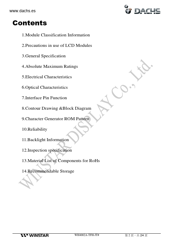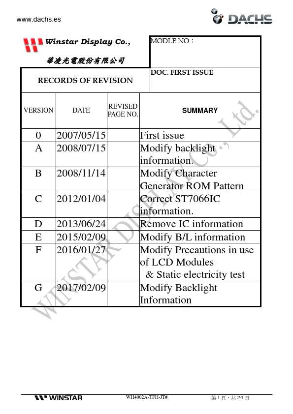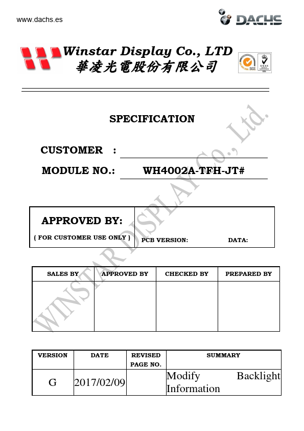 .dachs.es Winstar Display Co., LTD 華凌光電股份有限公司 SPECIFICATION CUSTOMER : WH4002A-TFH-JT# APPROVED BY: ( FOR CUSTOMER USE ONLY ) PCB VERSION:.