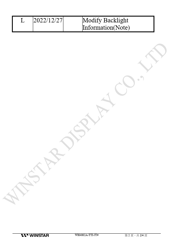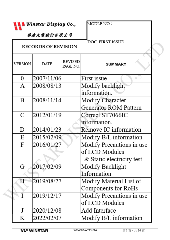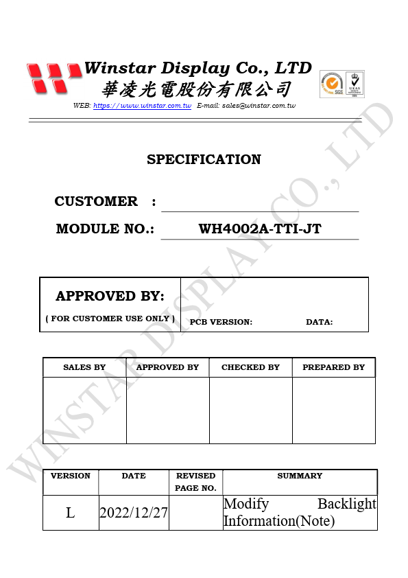 Winstar Display Co., LTD 華凌光電股份有限公司 WEB: https://.winstar..tw E-mail: sales@winstar..tw SPECIFICATION CUSTOMER.