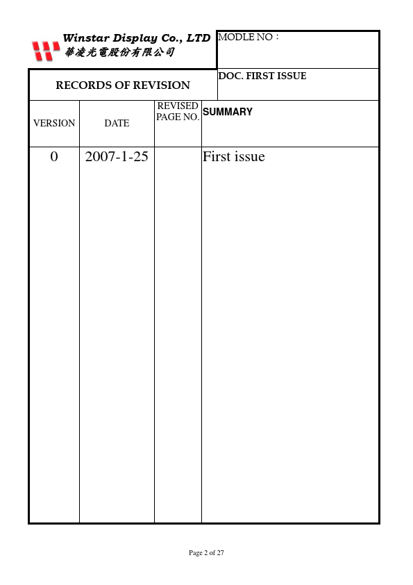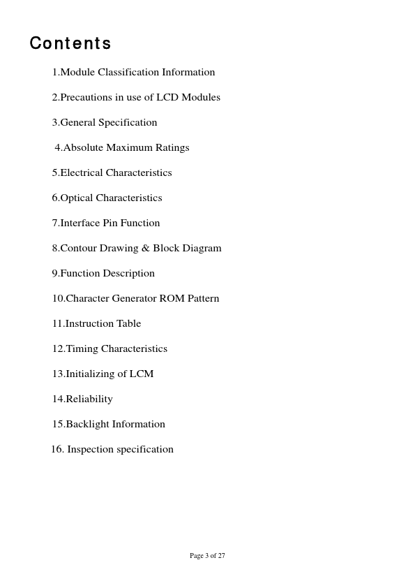 10.Character Generator ROM Pattern 11.Instruction Table 12.Timing Characteristics 13.Initializing of LCM 14.Reliability 15.Backlight Information 16. Inspection specification Page 3 of 27 1.Module Classification Information W H 4 0 0 2 A-Y G H- CT cd e f ghi j c Brand:WINSTAR DISPLAY CORPORATION d Display Type:H→Character Type, G→Graphic Type e Display Font:Character 40 words, 2Lines. g Backlight Type: N→Without...