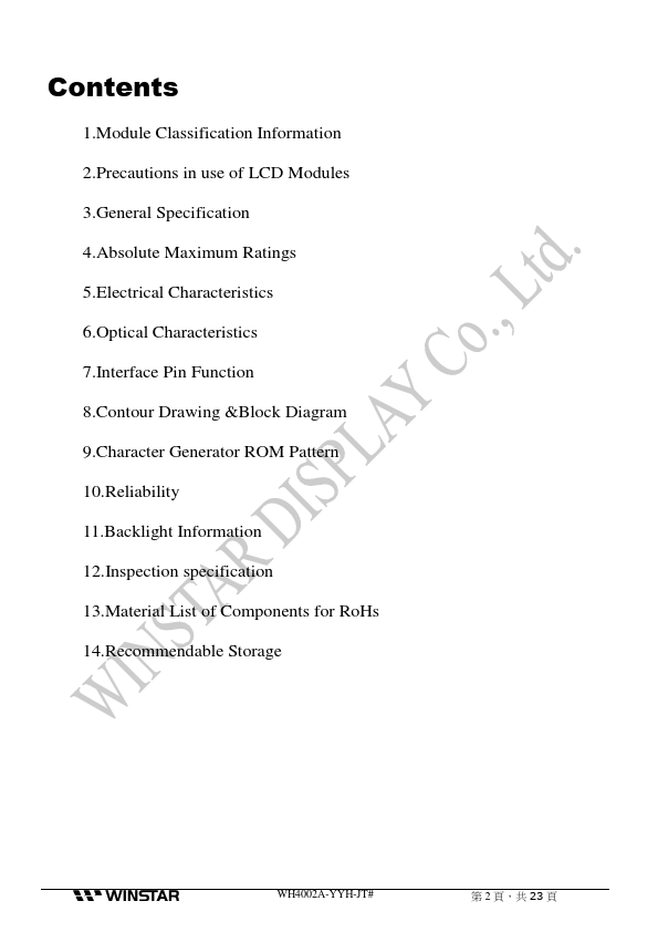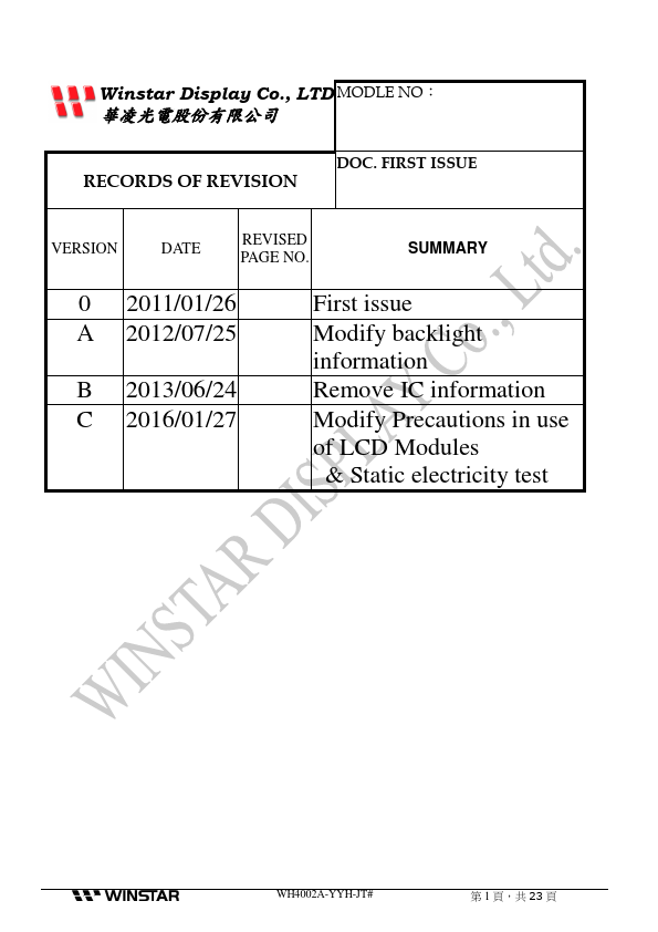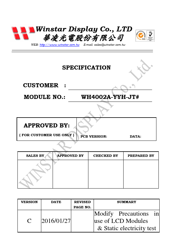 Winstar Display Co., LTD 華凌光電股份有限公司 WEB: http://.winstar..tw E-mail: sales@winstar..tw SPECIFICATION CUSTOMER.