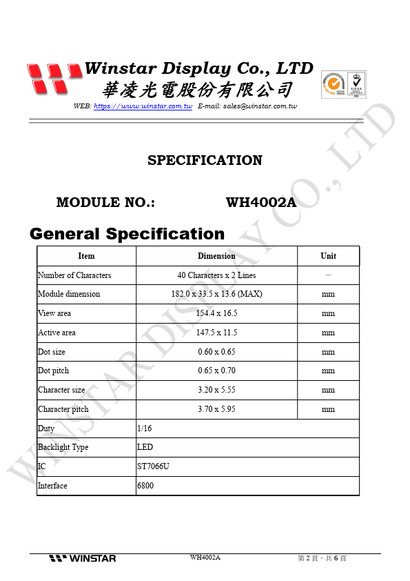 WH4002A is 40 x 2 Display manufactured by WINSTAR Display.