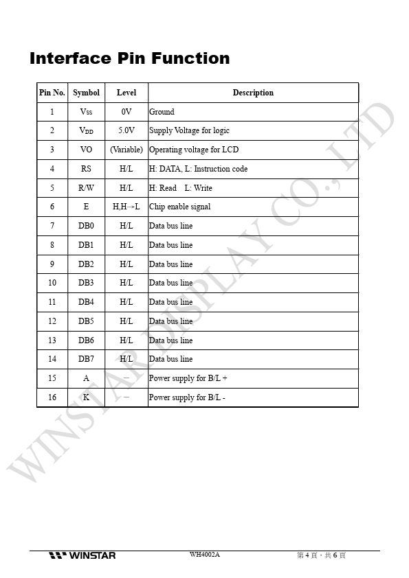 1 VSS 0V Ground 2 VDD 5.0V Supply Voltage for logic 3 VO (Variable) Operating voltage for LCD 4 RS H/L H: Instruction code 5 R/W H/L H: 0.65 DOT SIZE SCALE 5/1 WH4002A 第 5 頁,共 6.