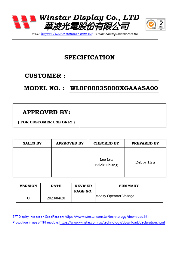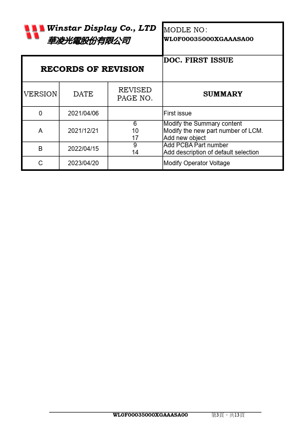 of default selection Modify Operator Voltage WL0F00035000XGAAASA00 第3頁,共13頁 Contents 1. Smart Display Classification Information 2. Product inspection check list 12.