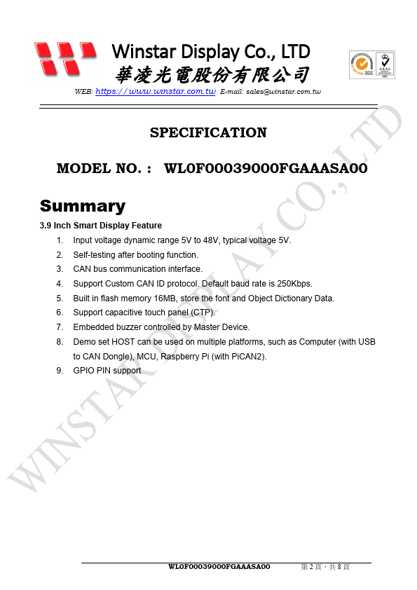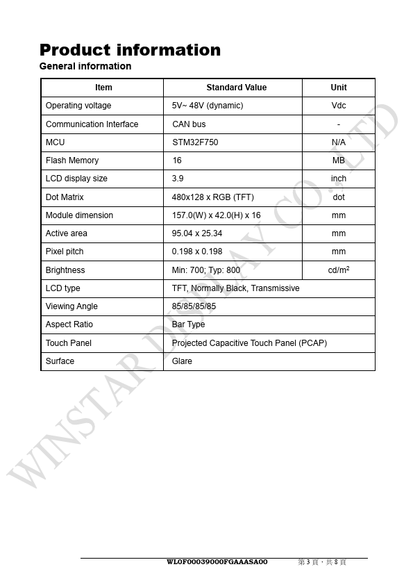 WL0F00039000FGAAASA00 is Smart Display manufactured by WINSTAR Display .