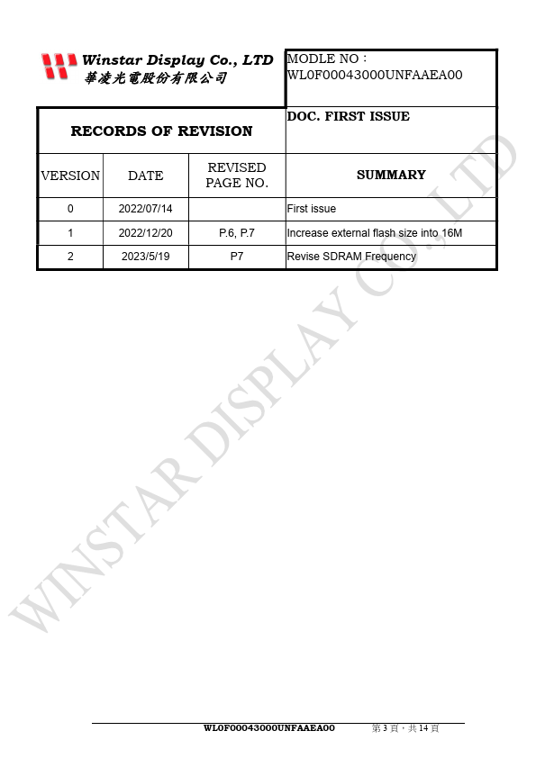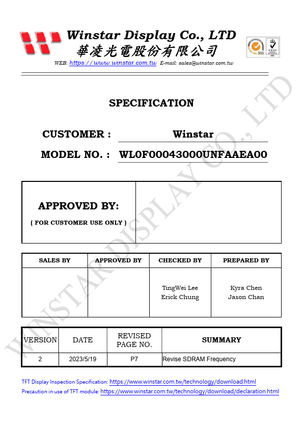 Winstar Display Co., LTD 華凌光電股份有限公司 WEB: https://.winstar..tw E-mail: sales@winstar..tw SPECIFICATION CUSTOMER.