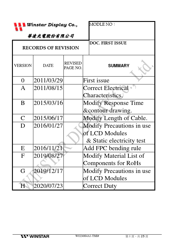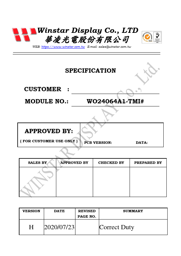 Winstar Display Co., LTD 華凌光電股份有限公司 WEB: https://.winstar..tw E-mail: sales@winstar..tw SPECIFICATION CUSTOMER.