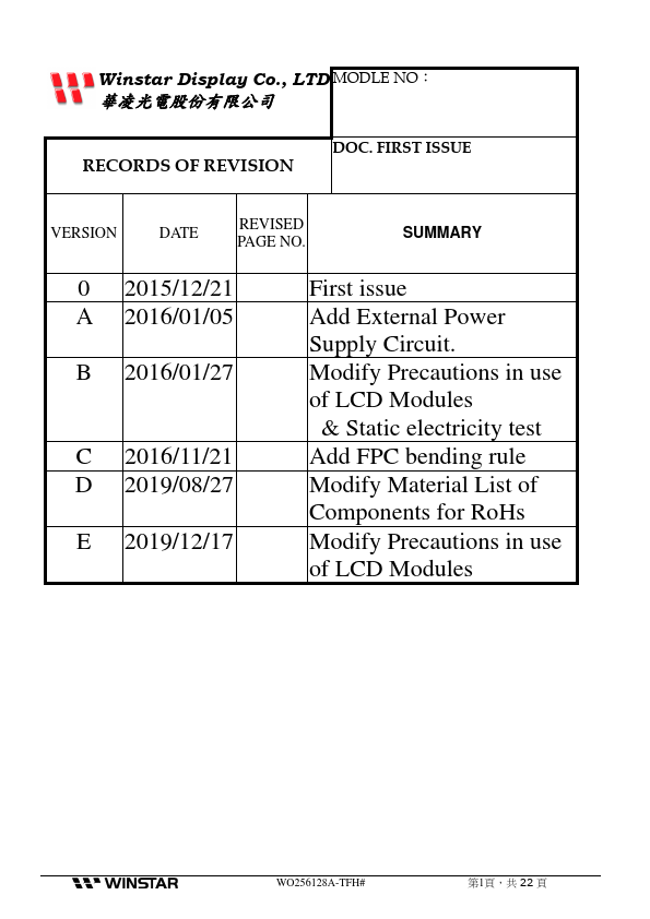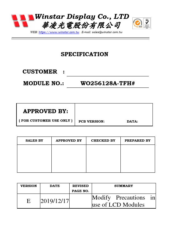Winstar Display Co., LTD 華凌光電股份有限公司 WEB: https://.winstar..tw E-mail: sales@winstar..tw SPECIFICATION CUSTOMER.