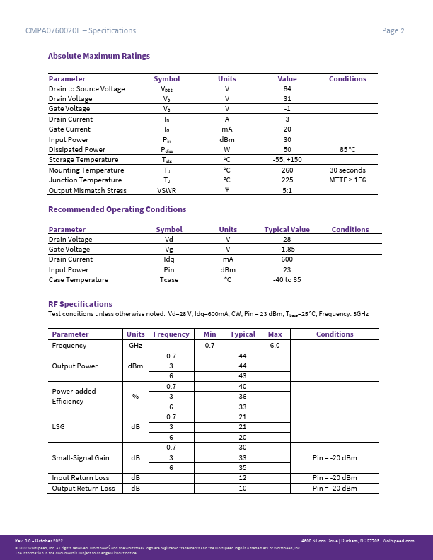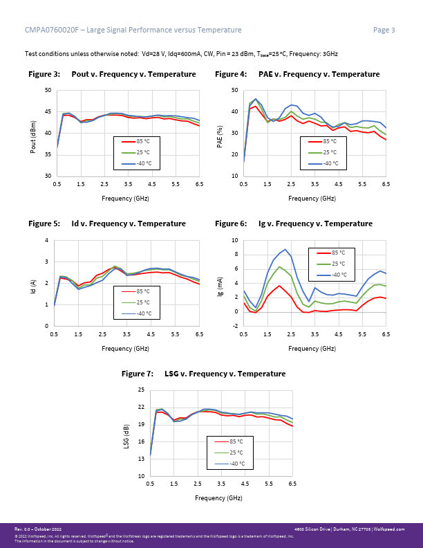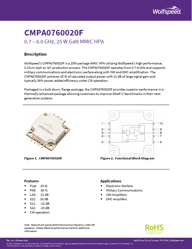 Wolfspeed’s CMPA0760020F is a 25W package MMIC HPA utilizing Wolfspeed’s high performance, 0.15um GaN on SiC production process. The CMPA0760020F operates from 0.7-6 GHz and supports military munications and electronic warfare along with ISM and EMC amplification. The CMPA0760020F achieves 25 W of saturated output power with 21 dB of large signal gain and typically 36% power-added efficiency under CW operation.