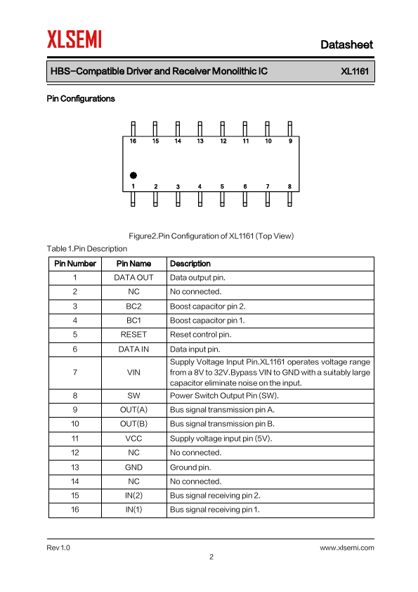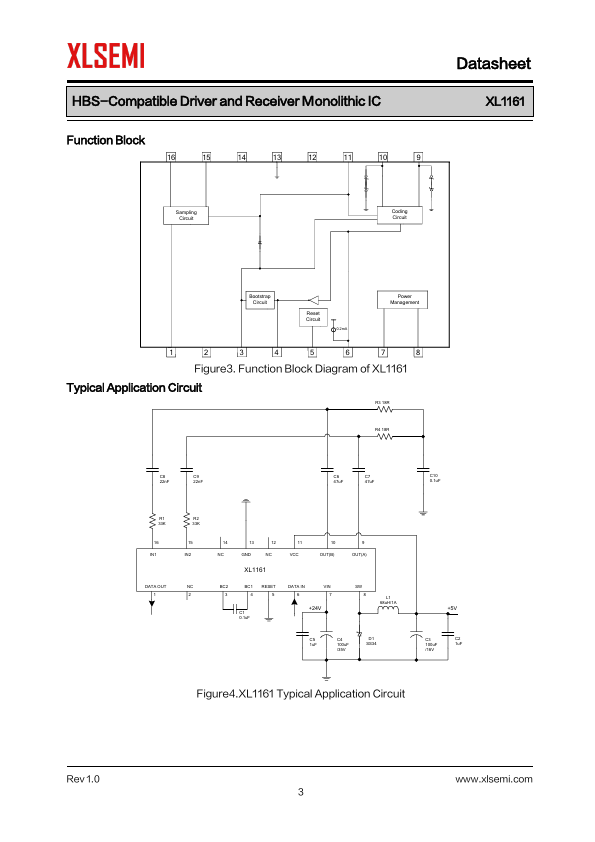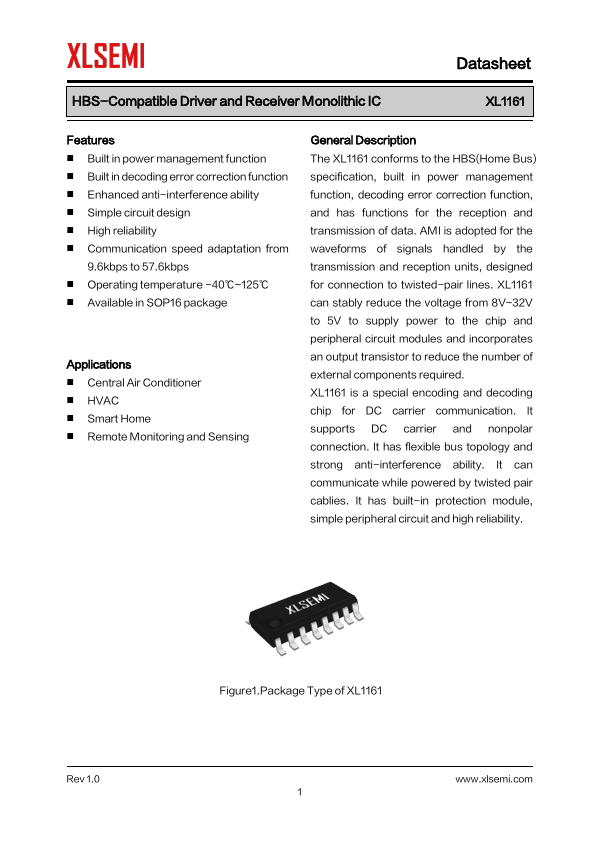 General Description The XL1161 conforms to the HBS(Home Bus) specification, built in power management function, decoding error correction function, and has functions for the reception and transmission of data. AMI is adopted for the waveforms of...